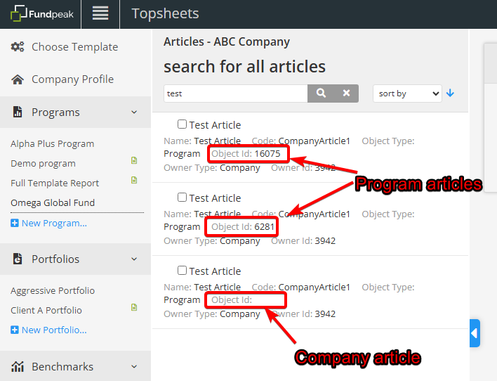 How to distinguish company articles from program articles when working in Company profile / Articles? Company articles always have an empty Object Id, while program articles always have the Object Id field filled in. See the screenshot below for more information.