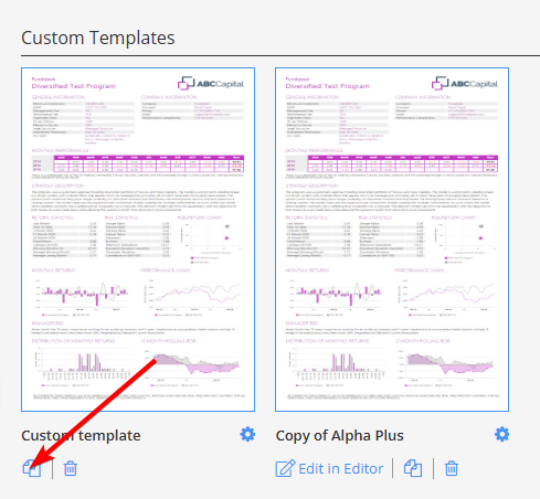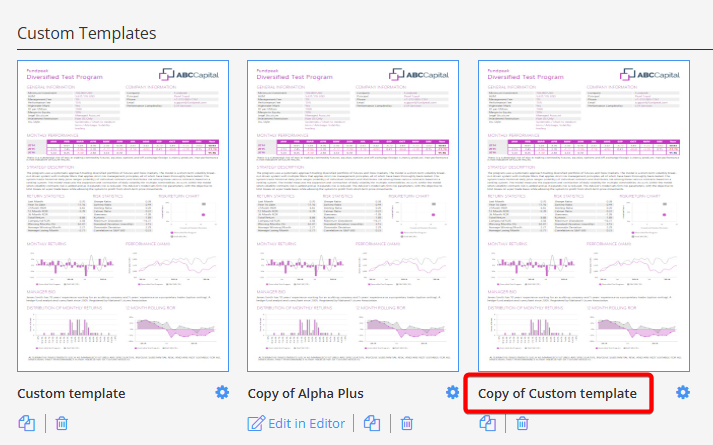 Any custom tearsheet template can now be duplicated directly from the Custom Templates section.
