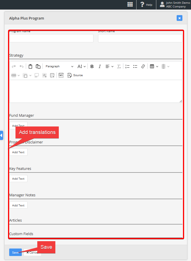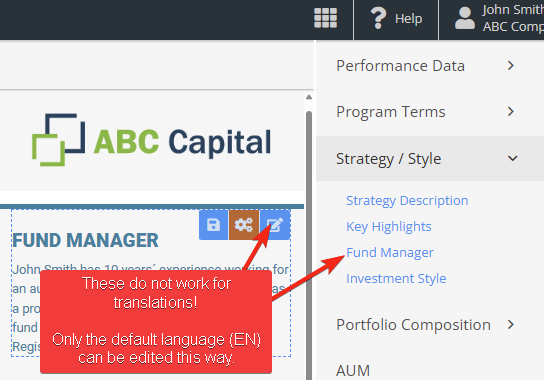 The text below explains how to manually change language and edit texts on one report. For mass-import of translated texts please see How to Import Fund Terms.